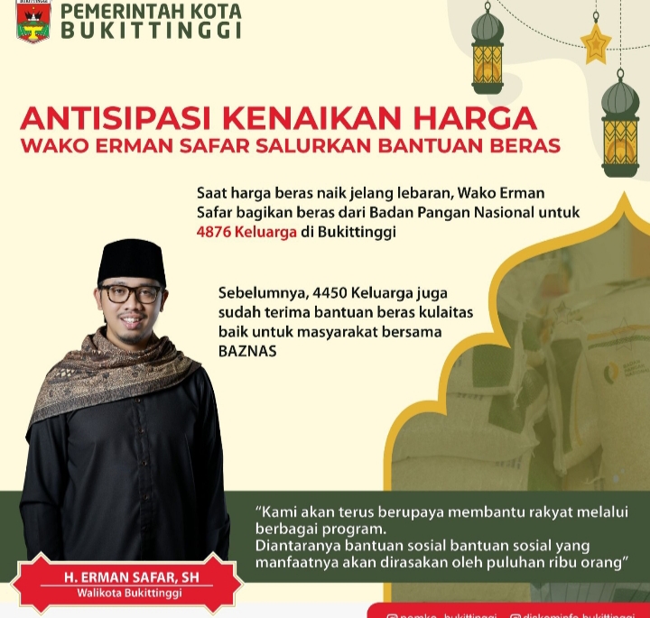 Saat harga beras naik jelang lebaran, Wali Kota Bukittinggi, Erman Safar bagikan beras dari Badan Pangan Nasional untuk 4876 keluarga di Bukittinggi.