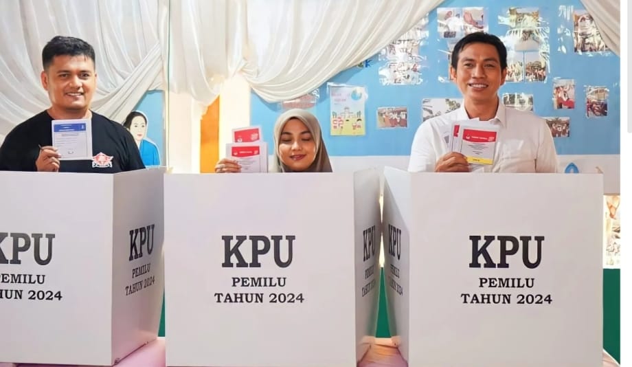 Bupati Batanghari, Mhd Fadhil Arief bersama keluarga besarnya mengikuti Pemilihan Umum (Pemilu) serentak di Tempat Pemungutan Suara (TPS) 11, Kelurahan Rengas Condong, Kecamatan Muara Bulian, Rabu (14/02/2024).