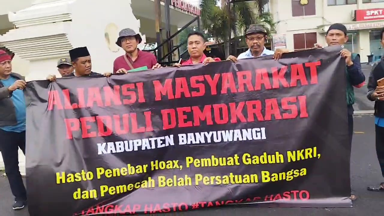 Sejumlah warga yang tergabung dalam Aliansi Masyarakat Peduli Demokrasi melaporkan Sekjen PDIP Hasto Kristianto ke Polresta Banyuwangi, Kamis (21/3).