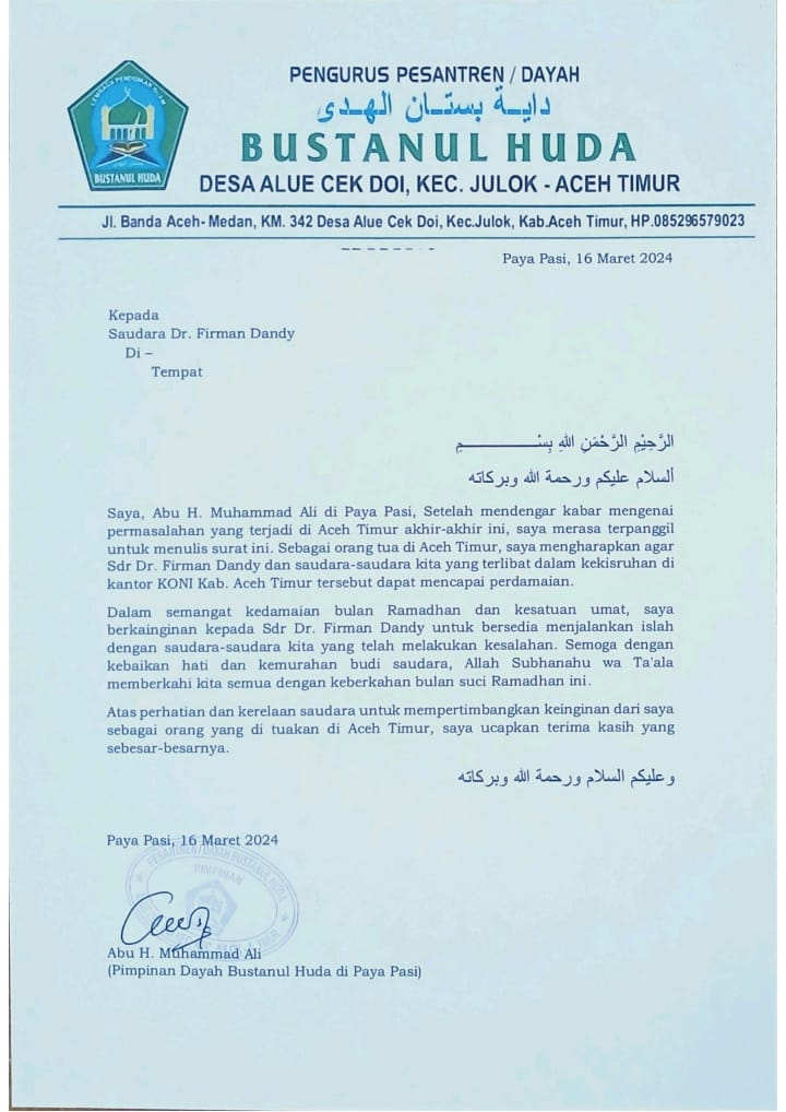 Dalam amatan awak media dari salinan surat yang ditulis Pada tanggal 16 Maret 2024 oleh ulama kharismatik asal Aceh Timur, Haji,. Muhammad Ali, yang biasa kita sapa Abu di Paya Pasi, menginginkan Keduabelah pihak ini bisa melaksanakan islah, (perdamaian) apalagi di bulan yang penuh Rahmah dan Maghfirah, ialah bulan Suci Ramadhan 1445 Hijriah.