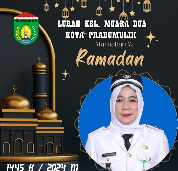 Tak terasa bulan suci Ramadhan Tahun 2024 sudah di depan mata, oleh karena itu Letti Ocvariani, S.KM., selaku Lurah Kelurahan Muara Dua Kota Prabumulih Sumsel. Mengucapkan selamat menyambut Bulan Suci Ramadhan 1445 H/2024 untuk seluruh umat muslim terkhusus bagi warga keluarahan Muara Dua. Senin (11/03/2024).