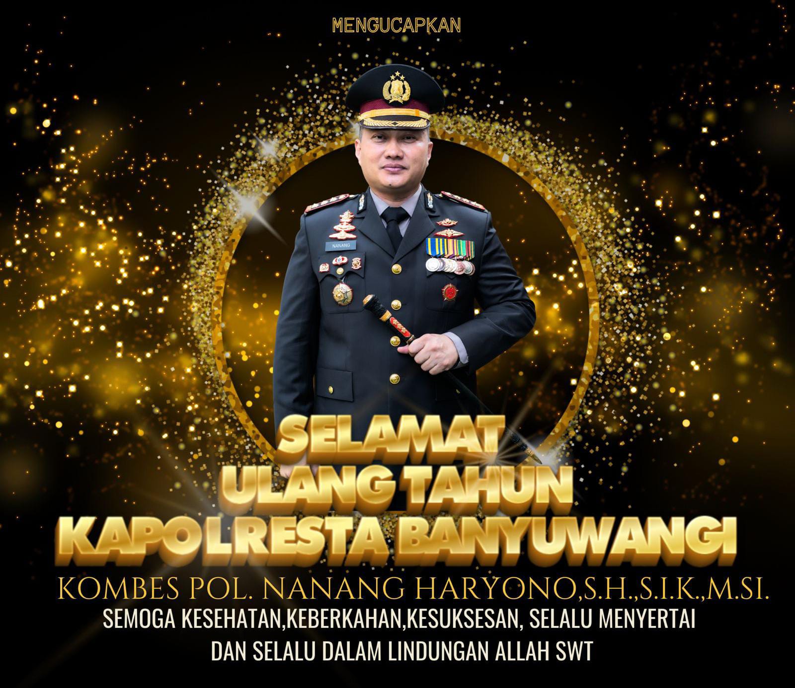 ” Selamat Ulang Tahun Pak Kapolresta Nanang Haryono , semoga di usia yang 47 Tahun bapak selalu diberikan kesuksesan, kesehatan, keberkahan serta selalu dimudahkan dalam mengemban dan amanah tugas negara di dalam institusi Kepolisian Republik Indonesia, karena tentunya tugas beliau sangat berat dalam salah satu institusi penegakan hukum khususnya di wilayah Kab. Banyuwangi, ”
