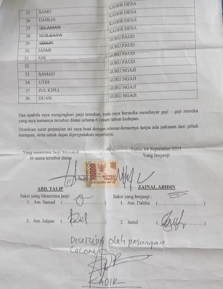 Janji politik oknum kepala desa terlis sangat memperihatinkan pasalnya sebelum pemilihan dahulu kepala desa terlis yang sekarang ini menjabat pernah membuat surat perjanjian bermaterai rp10.000 yang mana janji tersebut tidak di tunaikan, seolah-olahnya janji yang bermaterai itu hanya mainan dan tidak berbadan hukum, jelas narasumber