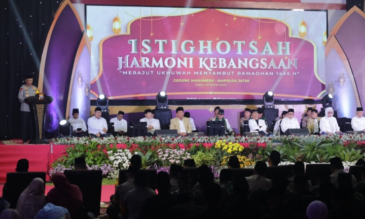 Dalam rangka menyambut datangnya bulan suci Ramadhan, Polda Jatim bersama Majelis Ulama Indonesia (MUI) Jawa Timur, menggelar Istighotsah Harmoni Kebangsaan “Merajut Ukhuwah Menyambut Ramadhan 1445 Hijriah” di Gedung Mahameru Mapolda Jatim,Sabtu malam (9/3).