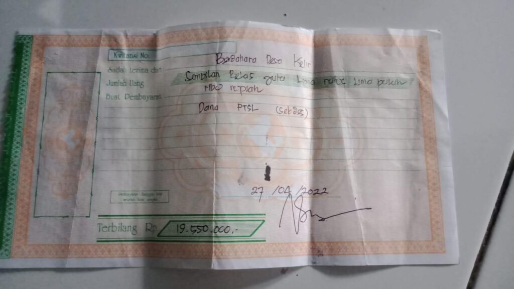 Lanjut Andi dari penerbitan dokumen-dokumen yang diterbitkan oleh Pemerintah Desa Kelir seperti Surat Keterangan Jual Beli, Surat Keterangan Hibah/Waris setiap warga dipungut biaya sebesar Rp 250.000 Perbidang sementara warga Desa Kelir pemohon Ptsl th 2022 sekitar 1300 orang