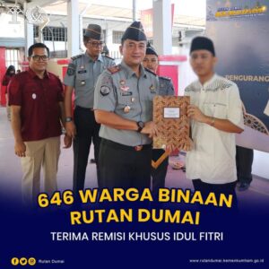 Pemberian remisi Idul Fitri diharapkan dapat menjadi dorongan bagi narapidana untuk terus memperbaiki diri dan mengambil peran aktif dalam program pembinaan di Rutan Dumai. ( Asmadi jpn)