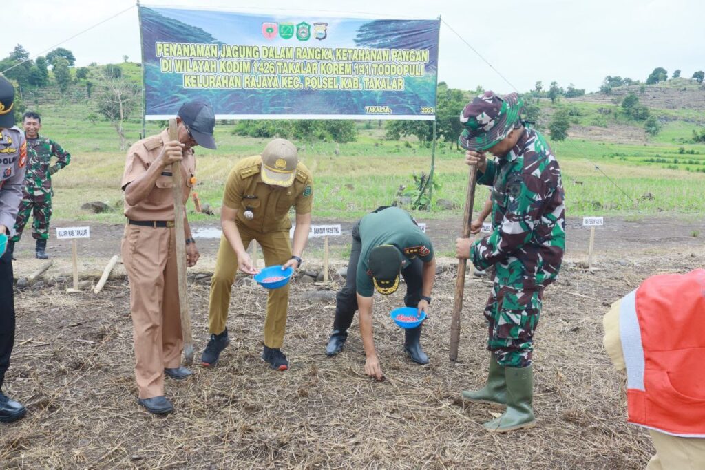 Kodim 1426/Takalar bersama dengan pemerintah daerah Kabupaten Takalar menggelar kegiatan ketahanan pangan dengan menanam jagung sebagai Ciri khas Kabupaten Takalar di wilayah Kelurahan Rajaya Kecamatan Polongbangkeng Selatan Kabupaten Takalar Provinsi Sulawesi Selatan Senin 01/04/2024.