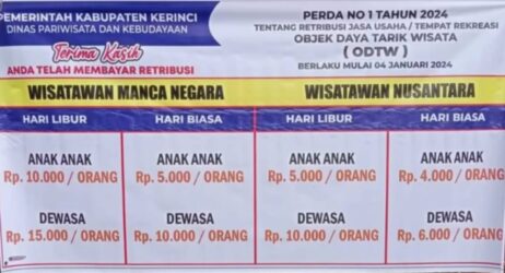 Pemerintah kabupaten Kerinci sudah resmi menetapkan tarif masuk objek wisata yang dikelola pemerintah daerah. Ada 5 objek wisata yang sudah ditetapkan tarif masuk.