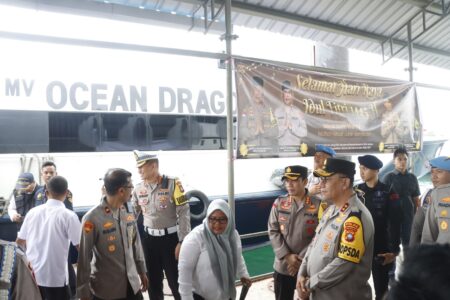 Kapolresta Barelang Kombes Pol Dr. Nugroho Tri N, SIK, MH mendampingi Kapolda Kepri Irjen. Pol. Drs. Yan Fitri Halimansyah, M.H, Wakapolda Kepri Brigjen. Pol. Asep Safrudin, S.I.K., M.H., Brigjen. Pol. Karolog Polda Kepri Jakub Prajogo, S.I.K, M.Si., PJU Polda Kepri dan PJU Polresta Barelang Berikan Tiket Gratis Mudik Tujuan Batam – Tanjung Pinang dan Batam – Tanjung Uban dalam rangka hari raya idul fitri 1445 H di Pelabuhan Domestik Telaga Punggur Kota Batam pada hari Jum’at. (5/4/24)
