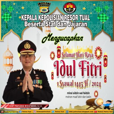 Kapolres Tual AKBP PRAYUDHA WIDIATMOKO S.I.K Beserta Staf dan Jajaran Mengucapkan Selamat Hari Raya Idul Fitri 1 Syawal 1445 H/2024 M, Minal Aidin Wal Faidzin ” MOHON MAAF LAHIR DAN BATHIN “