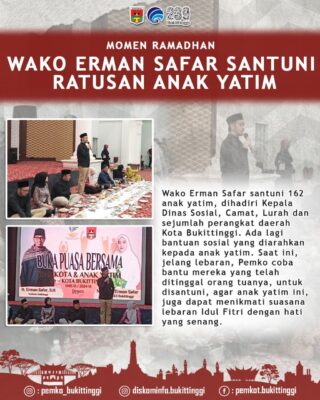 Wali Kota Bukittinggi, Erman Safar, menyampaikan, banyak program pemerintah yang bisa dilakukan untuk memperhatikan dan membantu masyarakat, termasuk anak yatim. Baik itu pendidikan, termasuk kesejahteraan dari anak yatim, menjadi salah satu target pemerintah kota.