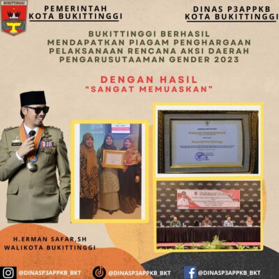 Pemerintah kota Bukittinggi dibawah kepemimpinan H. Erman Safar, SH menerima penghargaan Rencana Aksi Daerah Pengarusutamaan Gender Tahun 2023 dengan predikat sangat memuaskan pada hari Kamis, 18 April 2024.