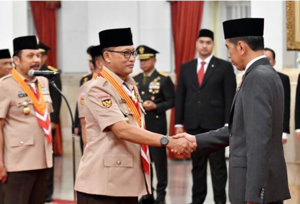 Bapak Presiden Joko Widodo mengukuhkan 113 orang Pengurus Kwartir Nasional (Kwarnas) Gerakan Praja Muda Karana (Pramuka) dan Pengurus Lembaga Pemeriksa Keuangan Kwartir Nasional Gerakan Pramuka Masa Bakti Tahun 2023-2028, Jumat (05/04/2024). Sebanyak 12 pengurus hadir langsung di Istana Negara, Jakarta, sedangkan pengurus lainnya mengikuti pengukuhan secara daring.