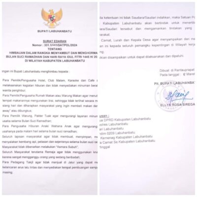 Surat Edaran Bupati Labuhan batu Nomor 331.1/1253/SATPOL/ 2024 tentang Himbauan dalam rangka menyambut dan menghormati bulan suci ramadhan dan hari raya idul fitri 1445 H 2024 M di wilayah Kabupaten Labuhan batu, yang dibuat di Rantau prapat pada tanggal 5 maret 2024 ditanda tangani Plt Bupati Labuhan batu Ellya Rosa Siregar, diduga mandul alias omon-omon , Demikian diungkapkan sabtu 7/4/2024