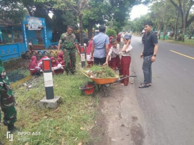 Tanamkan Kebersihan Sejak Dini, Koramil 02-/Polsel Ajak Siswa Bersihkan Halaman Sekolah