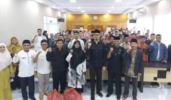 Guru PAI dari SD sampai SMA dan SMK se derajat negeri dan swasta ini, menerima paket lebaran berupa sembako, berisikan minyak, gula, beras dan telur.(Syafrianto)