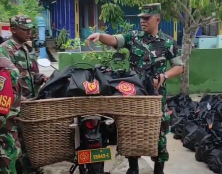 Anggota Danramil 04/Rupat tampak semagat walaupun sebagian personilnya tampak menggunakan Honda dinas dengan membawa keranjang dan paket bantuan menuju ke lokasi rumah warga di sekitarnya yang mendapat kan bantuan.(Asmadi)