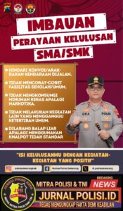 Hari kelulusan pelajar SMA/SMK/Sederajat akan diumumkan pada hari ini Senin 6 Mei 2024, Polres Semarang mengeluarkan himbauan kepada para pelajar untuk tidak melakukan berbagai kegiatab yang dapat mengganggu situasi Kamtibmas.