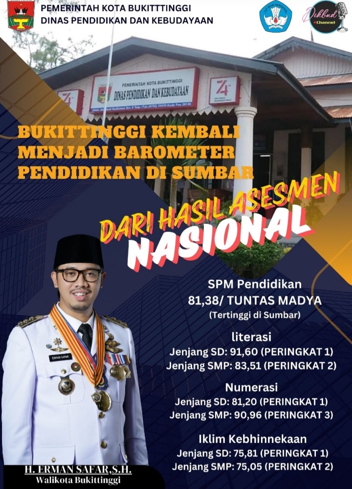Wali Kota Bukittinggi Erman Safar, didampingi Kepala Disdikbud, Herriman, menyampaikan, hasil asesmen tingkat nasional itu, dijabarkan, aspek literasi 91,60 dan numerasi SD 81,20 mendapat peringkat 1 di Sumbar, literasi dan numerasi SMP dengan nilai 83,51 dan 90.96 peringkat 2 dan 3 di Sumbar.