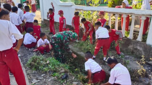 Peduli Kebersihan Sejak Dini, Koramil 01-/Polut Ajak Siswa Bersihkan Saluran Air Halaman Sekolah