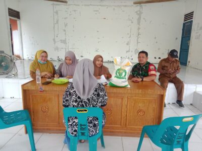 Hadir dalam penyaluran beras, Kades Menanti Sutiman, Para perangkat Desa Bhabinsa Menanti, dan para penerima manfaat.