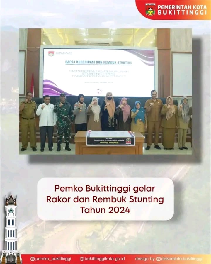 Pemerintah Kota Bukittinggi gelar Rapat Koordinasi dan Rembuk Stunting dalam rangka upaya percepatan penurunan stunting tingkat Kota Bukittinggi Tahun 2024. Kegiatan ini diikuti oleh unsur Forkopimda, Perguruan Tinggi, Kemenag, Kepala OPD, Camat, serta Lurah di Aula Balaikota Bukittinggi, Selasa, 28 Mei 2024.