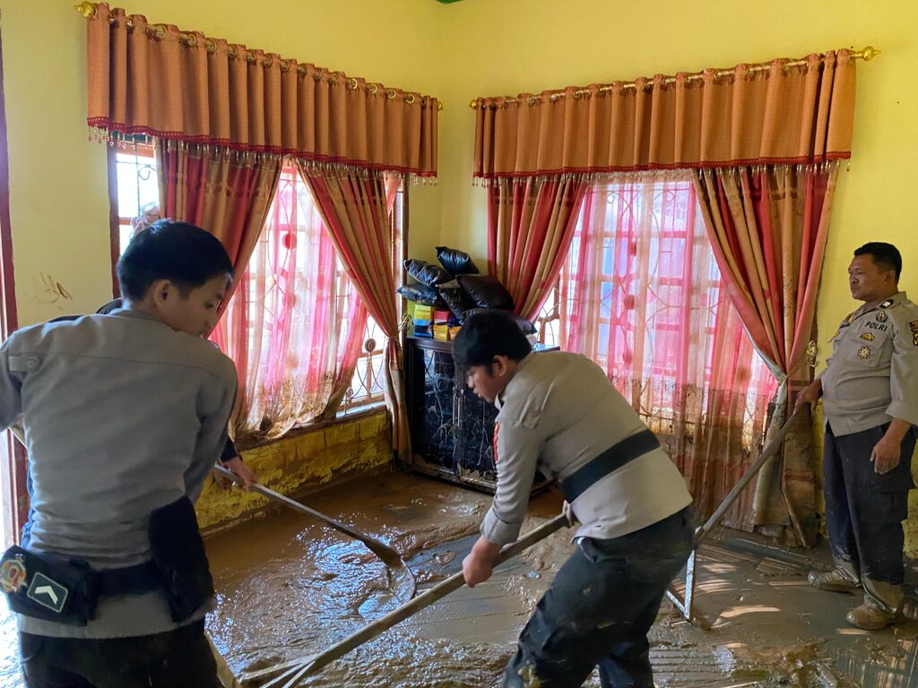 Pasca terjadinya bencana a Alam banjir dan tanah Longsor dibeberapa titik dalam wilayah Kab. Luwu, Anggota Polres Luwu dan Brimob membantu korban banjir dengan membersihkan lumpur dan Sampah pada rumah warga Korban banjir di Kab Luwu yang terdampak banjir, Sabtu 04/05/2024.