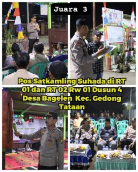 Juara 3: Pos Satkamling Suhada di RT 01 dan RT 02 RW 01 Dusun 4 Desa Bagelen, Kecamatan Gedong Tataan dengan total nilai 1.485 dengan rincian Aspek SDM 375, Aspek Sarpras 480, Aspek Operasional 550, Aspek Dukungan Masyarakat 50, Aspek Binsatkamling 400.