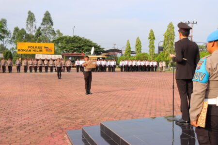 Upacara dengan Tema BANGKIT UNTUK INDONESIA EMAS di Polres Rohil, Kapolres AKBP Andrian Pramudianto SH SIK MSi bertindak selaku Inspektur Upacara, AKP Hanova Siagian, S.H.Selaku Perwira Upacara, Ipda Lukfi Naresi, S.A.P., M.M, Selaku Komandan Upacara, Bripda Ade Singgih, Bripda M Azmi, Bripda M.Yoan* Selaku Pengibar Bendera, Bripda Dwitra Selaku Pembaca Naskah UUD 1945 *Bripda Sri Ningsih dan Selaku Pembawa Acara.