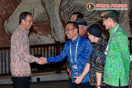 Presiden Jokowi yang mengenakan kemeja kain tenun sintang tiba di GWK, sekitar pukul 18.50 WITA. Presiden Jokowi kemudian menyambut kedatangan para tamu seraya berfoto bersama sebelum memasuki area jamuan.
