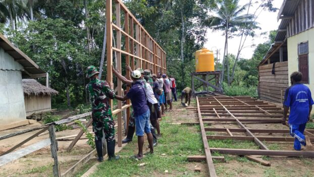 Satgas Pamtas Kewilayahan Yonif 125/SI’MBISA Pos Venaha gotong royong membantu proses pembangunan rumah Pastor Viktor (46) yang bertempat di Kampung Sahapikiya, Distrik Venaha, Kabupaten Mappi. Senin (06/05/2024).