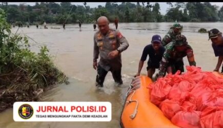 Dengan berjalan kaki dibantu personil BPBD dan TNI, Kapolres mendorong perahu karet milik Badan Nasional Penanggulangan Bencana (BNPB) yang dipenuhi paket sembako menuju perkampungan penduduk.
