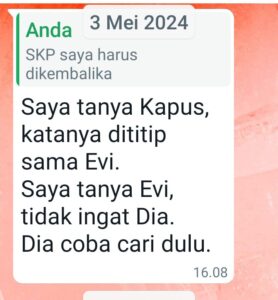 (3/4/2024) Kadinkes melalui chatting whatsapp memberitahukan Dokumen SKP ada pada Sekretaris nya “tidak ingat dia, dia coba cari dulu”, (kutipan chatting Kadinkes dr Irwan).