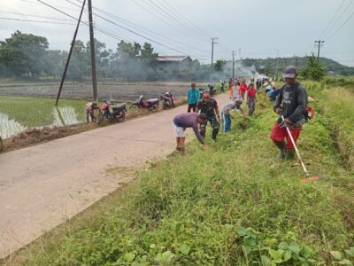 Sebagai Bintara Pembina Desa (Babinsa) Serka Samang bersama warga nampak kompak bahu membahu saling bekerjasama membersihkan saluran air dan rumput liar yang sudah rimbun dan sangat menggangu pemandangan menggunakan peralatan mesin rumput dan lainnya.