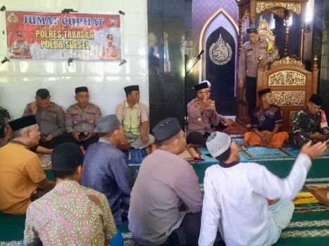 Jum’at Curhat program rutin Polres Takalar kembali digelar, kegiatan yang dipimpin langsung Kabag Ops Kompol Idrus selaku yang mewakili Kapolres Takalar AKBP Gotam Hidayat, kali ini dilaksanakan di Masjid Nurul Yakin, Dusun Tamajannang, Desa Banyuanyara, Kecamatan Mappakasunggu , Kabupaten Takalar Provinsi Sulawesi Selatan 07/06/2024