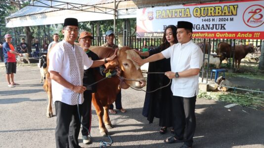 Setelah pelaksanaan sholat Idul Adha, acara dilanjutkan dengan prosesi penyerahan hewan kurban oleh Kapolres berupa 7 ekor sapi dan 21 ekor kambing kepada panitia kurban Polres Nganjuk untuk disembelih dan dibagikan kepada kaum duafa dan masyarakat yang membutuhkan.