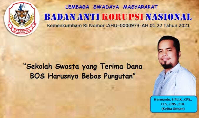 Ketua Umum LSM BAKORNAS Hermanto, S.Pd.K., .PS., CLS., CNS., CHL mengatakan aturan dan ketentuan yang berlaku terkait sekolah yang menerima anggaran Dana Bos tentu sama baik itu sekolah swasta maupun sekolah negeri.