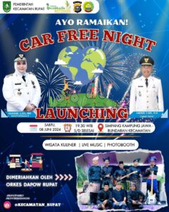 Suatu terobosan baru dalam rangka memberikan Suasana yang berbeda di malam libur di Kecamatan Rupat dengan melaksanakan Car Free Night pada Hari Sabtu tanggal 8 Juni 2024 yang dimulai pukul 19.30 malam nanti.