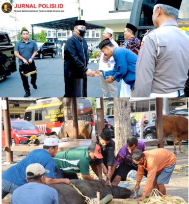 Kegiatan pemotongan hewan Kurban sebanyak 7 ekor hewan kurban terdiri dari 6 ekor sapi dan 1 kambing, di halaman masjid Mapolresta Banyuwangi.