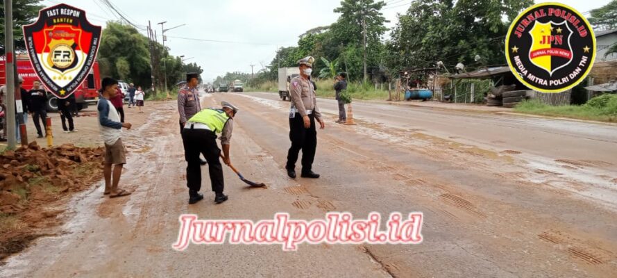 Sigap Laporan Warga, Personil Polsek Cikande Bersihkan Ceceran Tanah