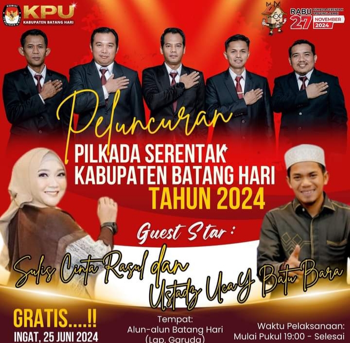 HADIRI ACARA PUNCAK PELUNCURAN PILKADA SERENTAK KABUPATEN BATANGHARI TAHUN 2024. YANG DIHADIAHKAN USTADZ UCAY BATU BARA. BERTEMPAT DI ALUN ALUN LAPGAR MUARABULIAN PADA MALAM RABU. JAM 19.wib.