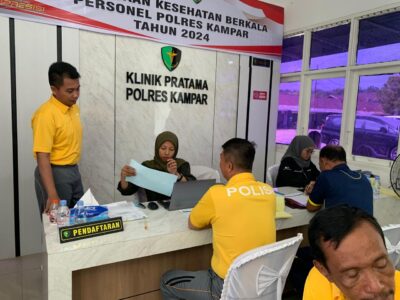 Untuk memastikan keseluruhan kesehatan personil Polres Kampar, Biddokkes Polda Riau dan TIM Labor RS. Awal Bros Pekanbaru melaksanakan pemeriksaan seluruh personil di ruang Klinik Polres Kampar secara berkala, Sabtu (6/7/2024) sekira pukul