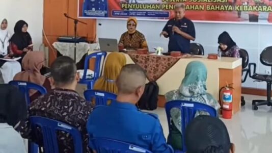Dalam sosialisasi ini, Narasumber, Refriyus dari Bidang Pencegahan,Dinas Damkar dan Penyelamatan, menjelaskan tentang bahaya kebakaran, asal muasal terjadinya api, cara pemadaman saat api kecil menggunakan APAR.(Syafrianto)