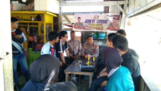 Kapolsek Galesong Utara jajaran Polres Takalar, IPTU Hatta, S.H. bersama anggota mendengarkan aspirasi masyarakat melalui program ‘Jum’at Curhat’ di Kedai Sabrina, Desa Aeng Towa, Kecamatan Galesong Utara, Kabupaten Takalar, Provinsi Sulawesi Selatan Jum’at 12/07/2024