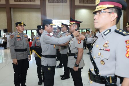 Kapolda Sulawesi Selatan Irjen Pol Andi Rian R Djajadi, S.I.K., M.H. didampingi Ketua Bhayangkari Daerah Sulawesi Selatan Ny. Dewwy Andi Rian Memimpin Langsung Serah Terima Jabatan dan Kenal Pamit Pejabat Utama dan Kapolres Jajaran Polda Sulawesi Selatan di Aula Mappaodang Polda Sulawesi Selatan , Senin 08/07/2024.