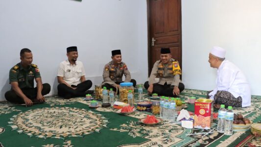 Kapolres Nganjuk AKBP Siswantoro, S.I.K., M.H., bersama beberapa Pejabat Utama (PJU) dan Kapolsek Prambon berkunjung ke kediaman Ketua MUI kabupaten Nganjuk sekaligus Rois Syuriah PCNU Nganjuk, KH. Ali Mustofa Said, Desa Tanjungtani, Kecamatan Prambon, Kabupaten Nganjuk, Selasa (30/7/2024).