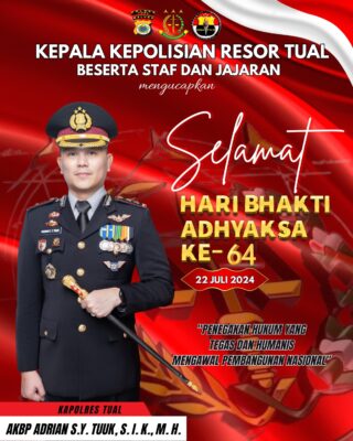 Kapolres Tual (AKBP ADRIAN S.Y.TUUK, S.I.K, M.H) Beserta Staf dan Jajaran Mengucapkan Selamat Hari Bhakti Adhyaksa ke 64, ” PENEGAKAN HUKUM YANG TEGAS DAN HUMANIS MENGAWAL PEMBANGUNAN NASIONAL “