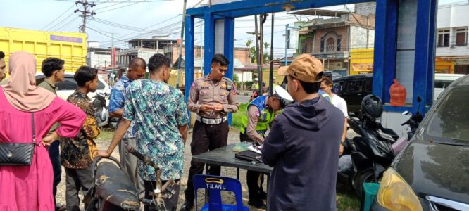 Satlantas polres Aceh Timur bersama dinas perhubungan Aceh Timur menggelar razia dalam rangka Operasi patuh Seulawah 2024 di depan kantor satlantas polres Aceh Timur,Idi Rayeuk (17/7/2024).