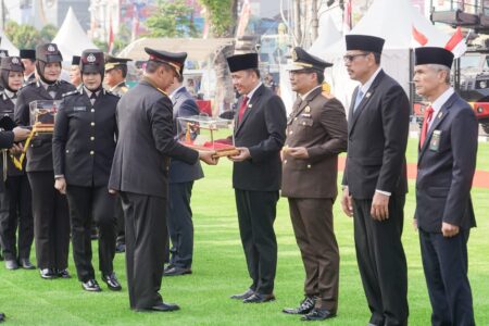 Penjabat (Pj) Gubernur Sumatera Utara (Sumut) Agus Fatoni menerima penghargaan berupa pin emas, piagam dan tongkat dari Kapolri Jenderal Listyo Sigit Prabowo. Penghargaan ini diserahkan langsung oleh Kapolda Sumsel Irjen Pol. A. Rachman Wibowo usai upacara peringatan HUT ke-78 Bhayangkara di Halaman Mapolda Sumsel, Palembang, Sumatera Selatan, Senin (1/7/2024).