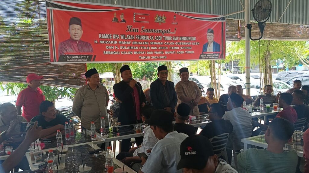 14 Juli 2024 Ratusan jajaran Komite Peralihan Aceh (KPA) Aceh Timur dengan tegas menyatakan dukungan mereka untuk pasangan calon Bupati dan Wakil Bupati Aceh Timur, H. Sulaiman (Tole) dan Abdul Hamid (Apong). Dukungan ini disampaikan dalam sebuah acara yang dihadiri oleh Nato Panglima 05 Sagoe Idi, yang menegaskan bahwa H. Sulaiman adalah sosok solutif dan visioner untuk memimpin Aceh Timur ke depan.